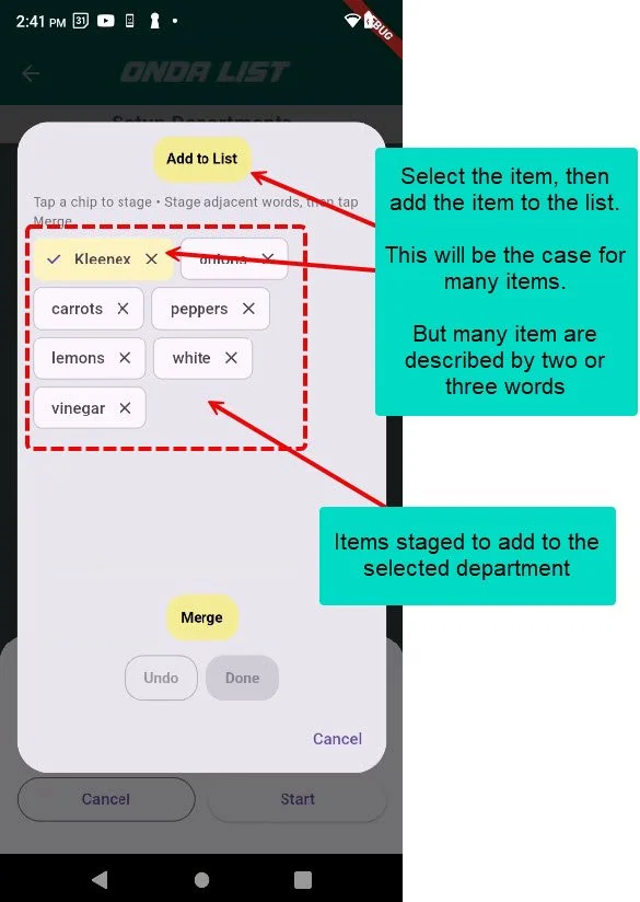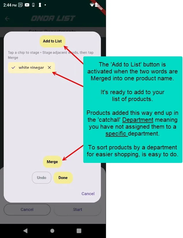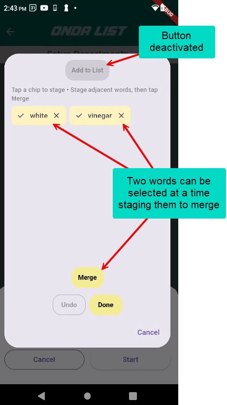 Dictating a list will give you individual words. That may not be what you want. Combine words easily for two or three-word products like ‘White Vinegar’ or ‘Garlic Chili Paste’